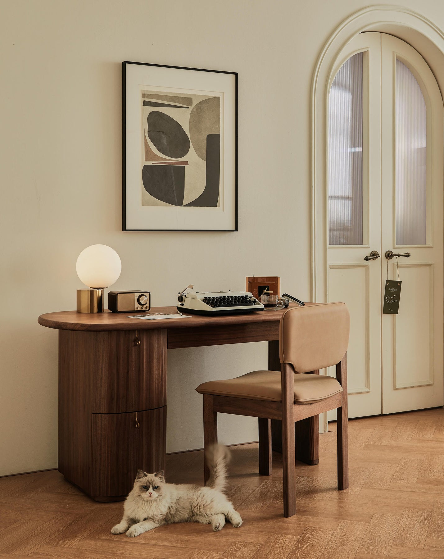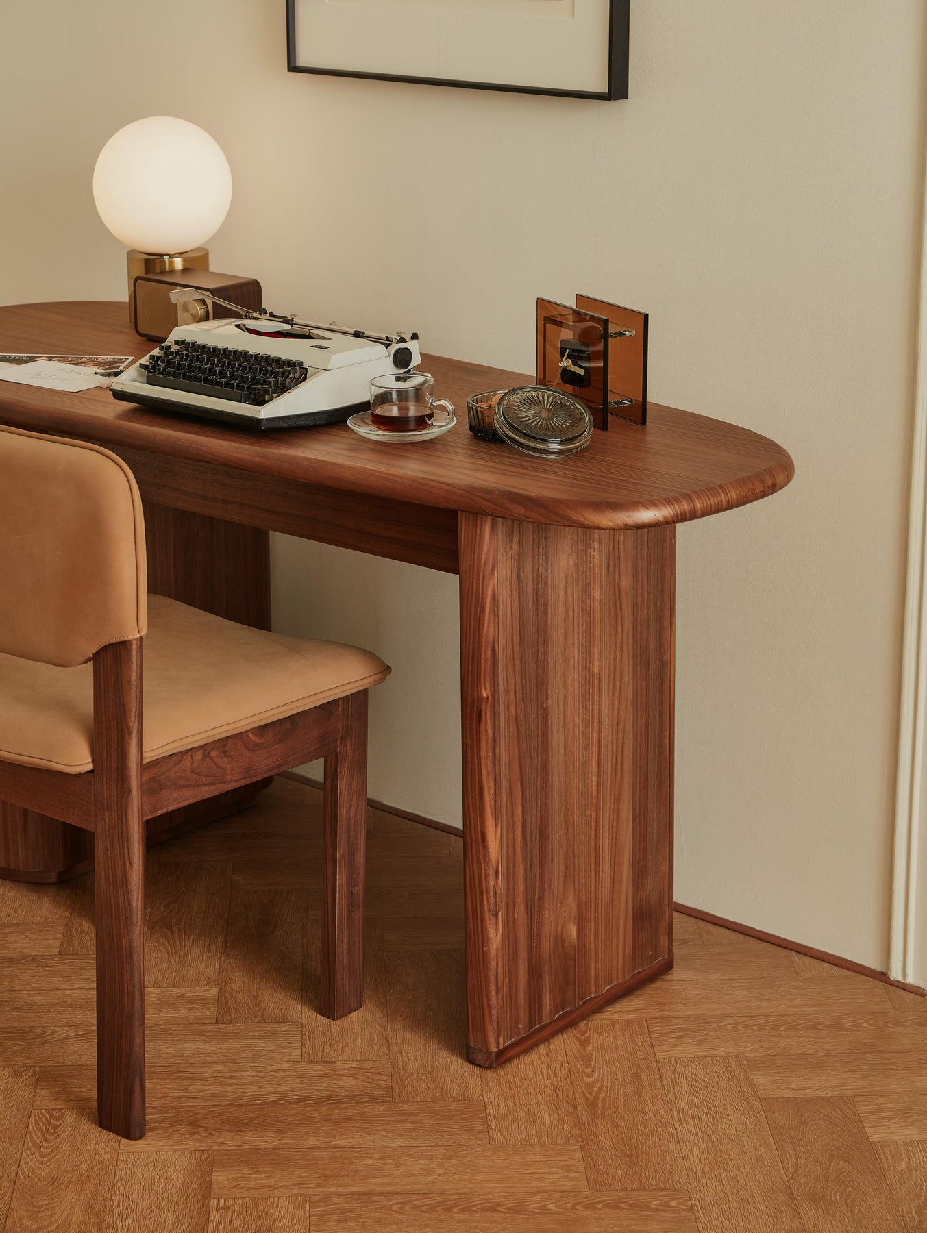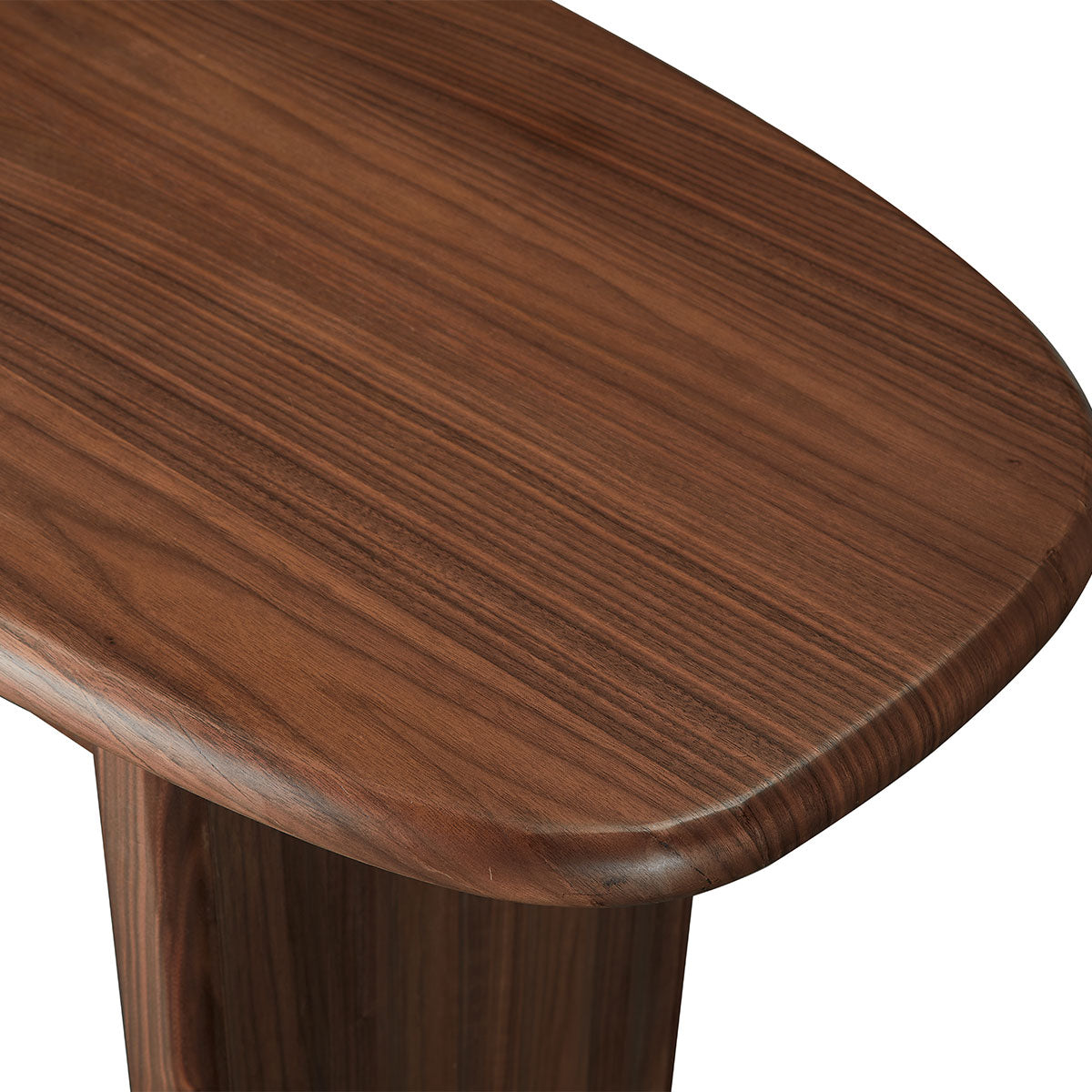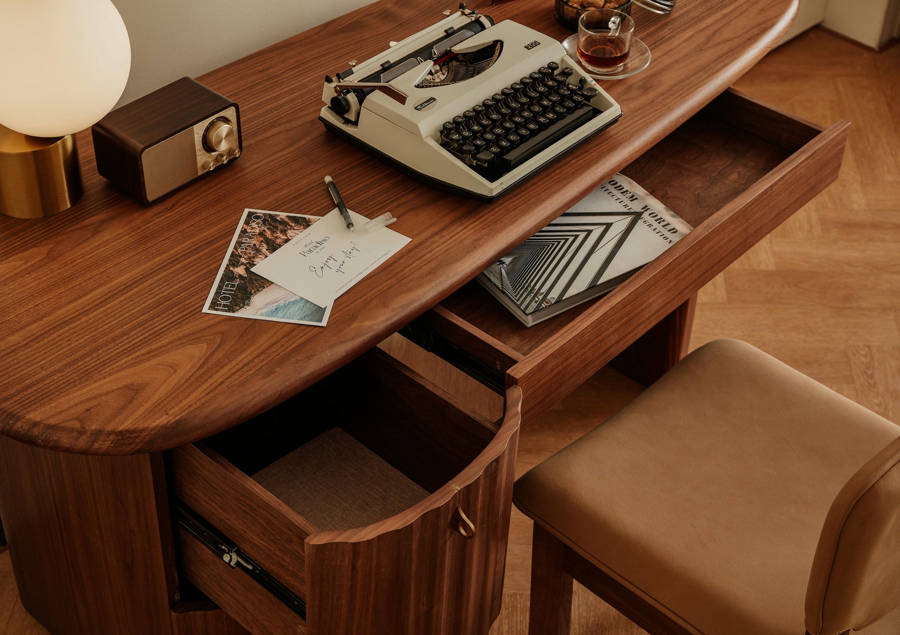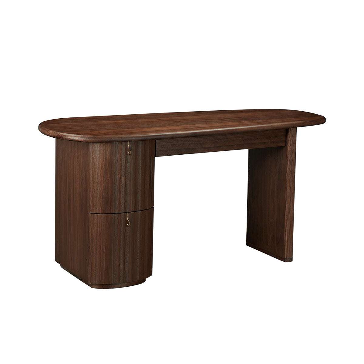 The Hotel Paradiso Writing Desk combines sculptural elegance with practical design. Its distinctive tapered oblong top and narrow-ended base create and artistic silhouette, while the walnut veneer adds warmth and sophistication. Featuring a convenient pull-out drawer with brass-colored stainless steel handles and two additional storage drawers, this statement piece draws inspiration from classical architecture with its fluted detailing, offering both dramatic presence and functional workspace.