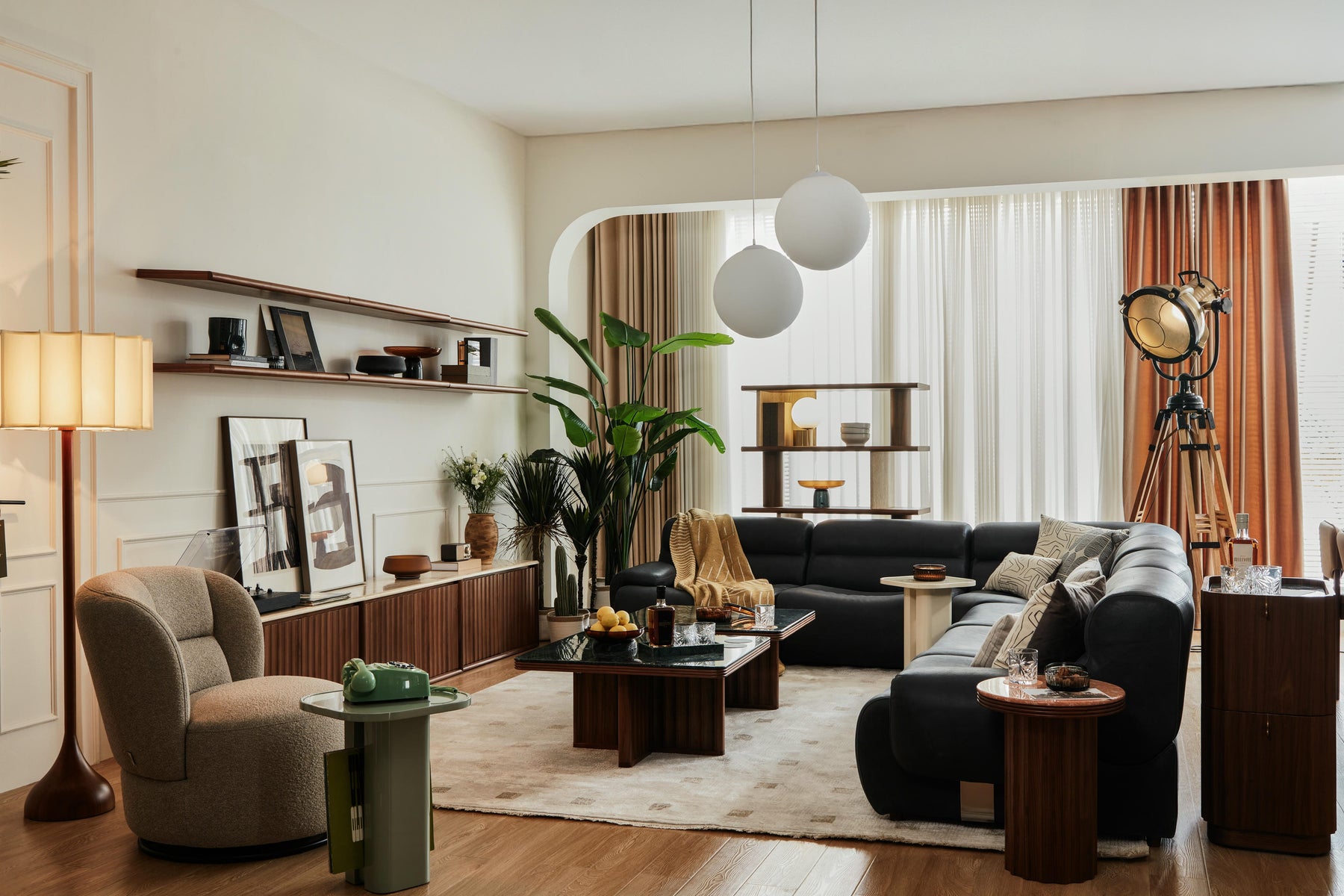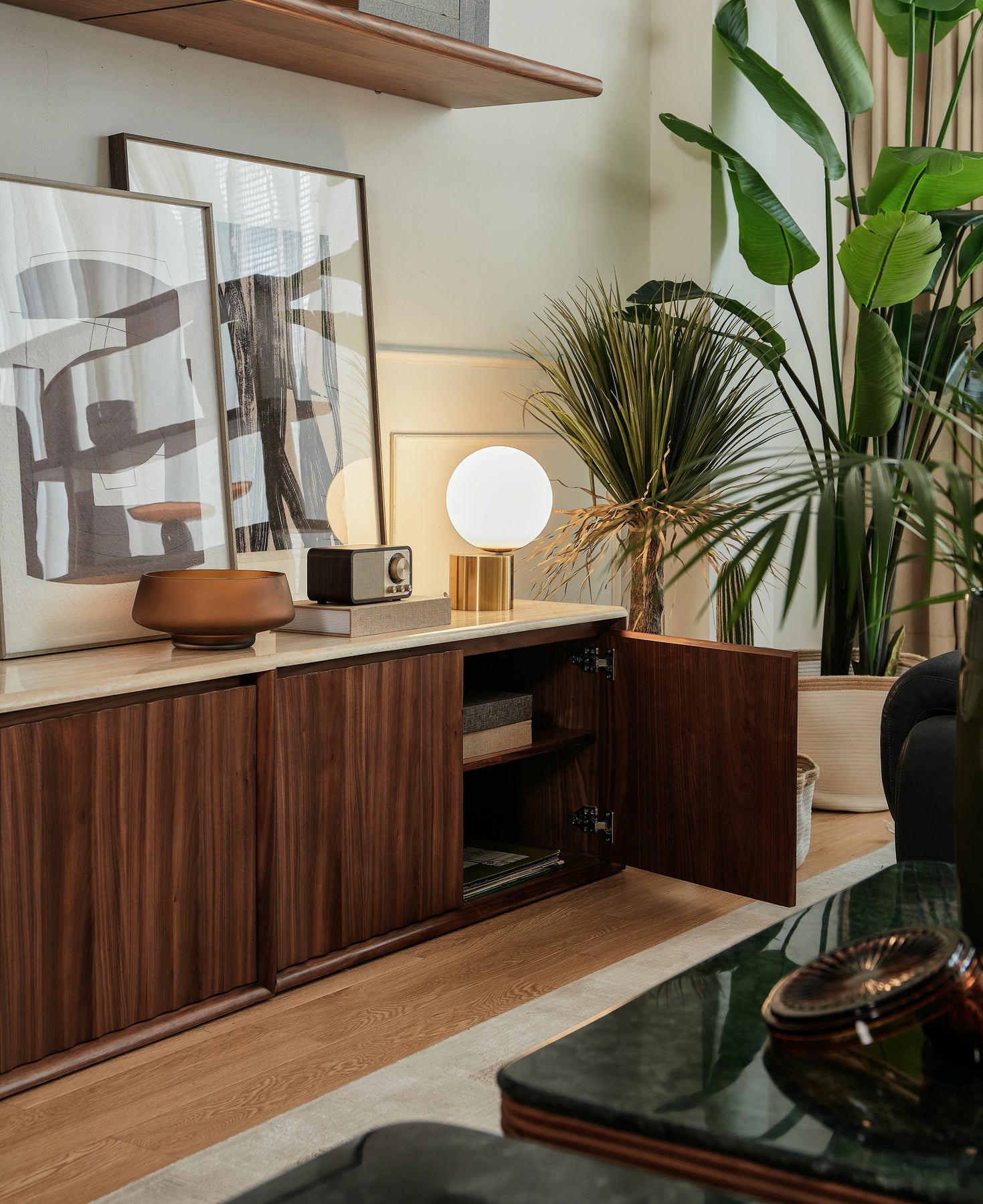 The TV Unit seamlessly combines luxury and functionality. Its elegant travertine marble top crowns a thoughtfully designed storage solution featuring two vertical fluted doors that open to reveal four spacious compartments, all finished in rich walnut. The curved side profile enables multiple units to be placed together for a custom look, while its freestanding design offers the flexibility to reimagine your space at will. Drawing inspiration from classical architecture, the fluted door detail adds timeless sophistication, while the additional lower shelf provides practical storage without compromising style.