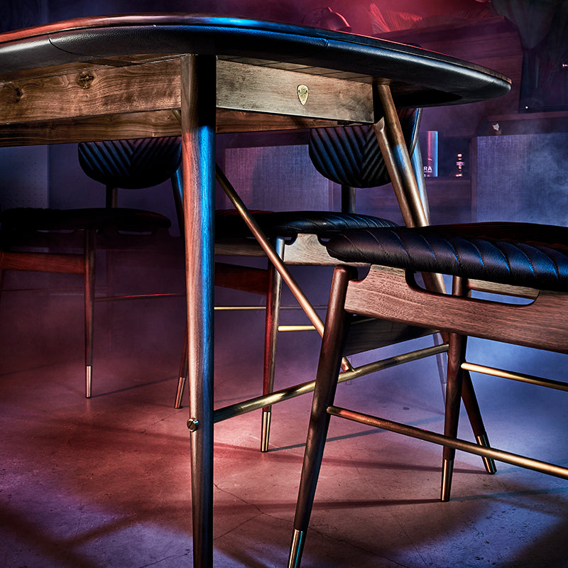• Solid American walnut table top with leather trim surrounds